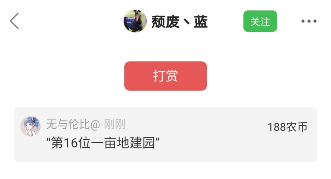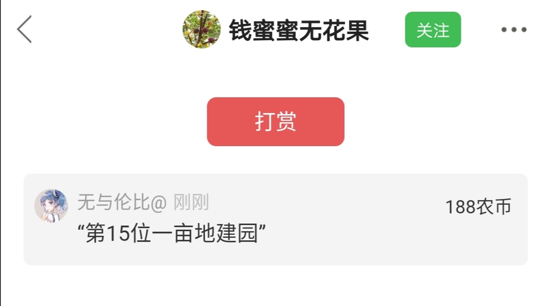 无与伦比@ 发表于 2021-02-17 17:40 跟帖建个一亩地园,打赏188农币