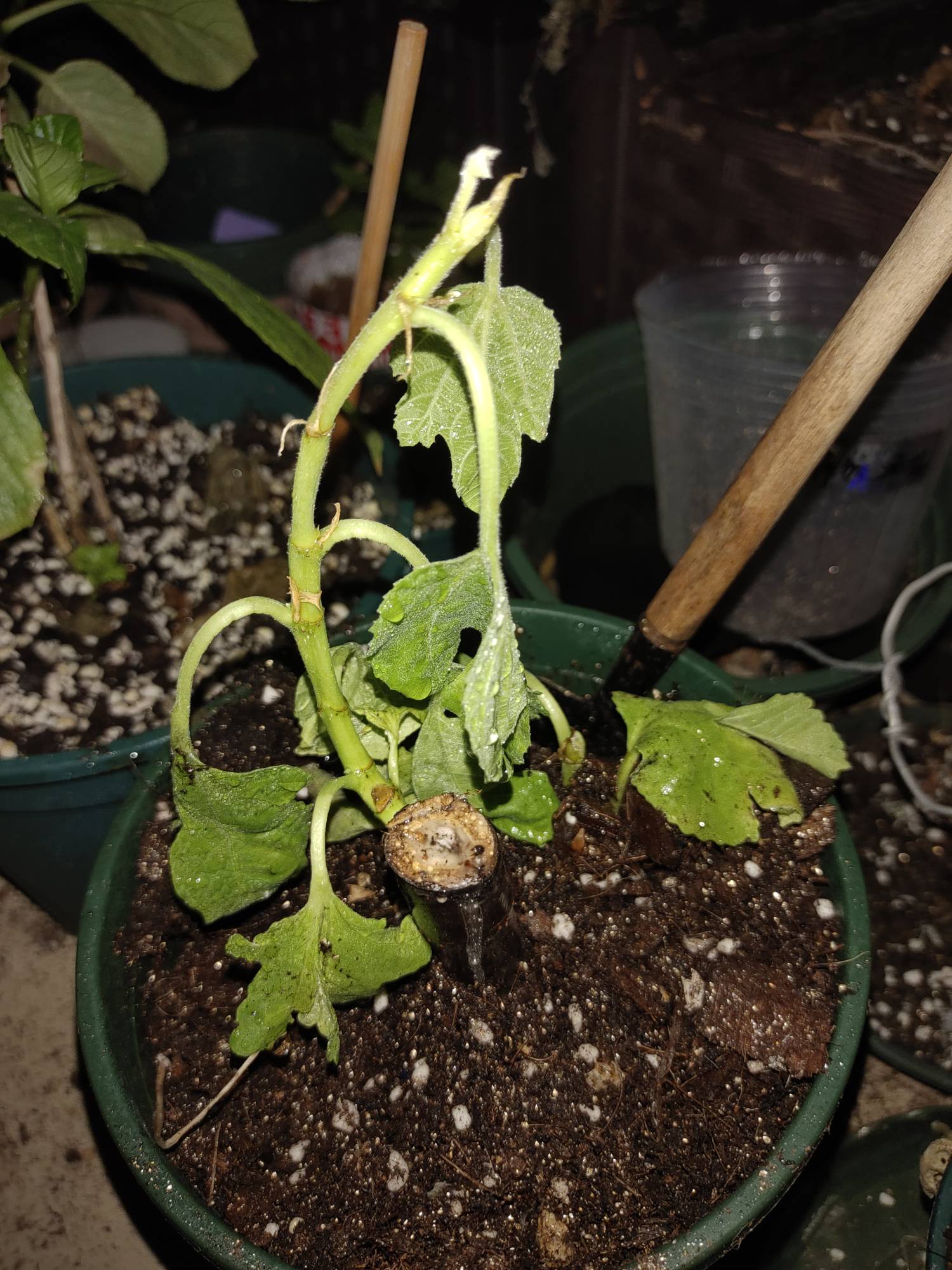 杨尚武 发表于 2021-06-30 21:45 补一下图,昨天发现叶子软的时候,土是偏干的,第一反应就是换个大点的盆,但是今天发软更加严重了,于是我处理了一下,我个人觉得原因可能是阳台光照条件不好,又是封闭阳台,通风也不太行,两根分枝也可能是枝条承受的极限了,加之扦插以来没有系统性的给过肥,只是偶尔两次养龟水,很可能是根系吸收不到营养供给,叶片光合能力受限,阴雨天温度一高导致叶片发软,于是我埋了点骨粉,浇了百菌灵和氮磷钾水溶液,叶片喷了花多多水溶液,当然非常有可能适得其反,但是还是勇敢的尝试一下