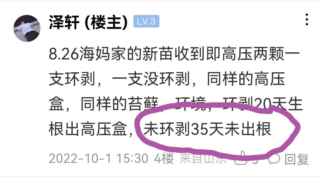 山村渔夫 发表于 2022-10-01 17:56 1.老农常说环割后出根时间短、出根量大,一是有毫无争议的理论依据、二是有大量实际事实,有人偏不信,谢谢楼主验证,打赏88农币。 2.本地淅淅春雨期、绵绵秋雨期,气温合适、湿度极大,葡萄、无花果等等会出大量汽生根,故只要介质疏松透气、沥水且有一定的保湿能力,高压环割否、都能出根,环割髙压、本地雨期大概10天左右出根。 3.山东有人不环割高压、19天出根,楼主下次可增加湿度试试、或许出根时间要短点。 再、成品髙压盒不是太好用,小、密封性一般、操作不是太方便,楼主可试试带拉链的自封袋,具体详@Warlock的帖子《抓住秋天的小尾巴,高压一波》。 文章链接: https://bbs.shuiguobang.com/forum.php?mod=viewthread&tid=1327082