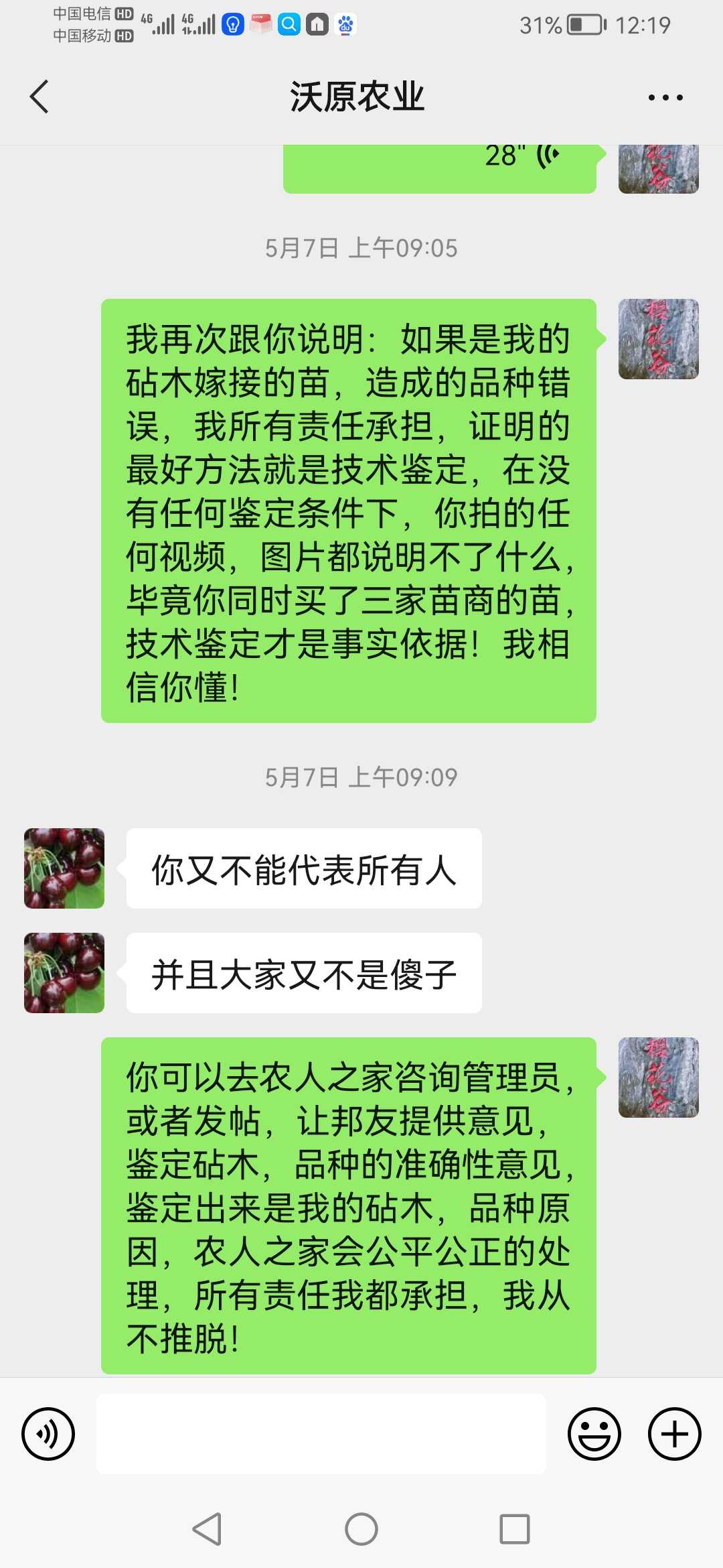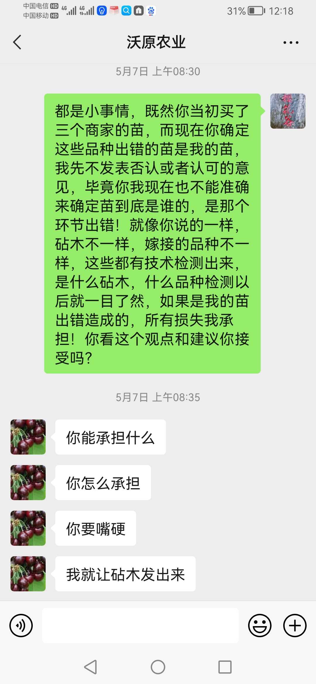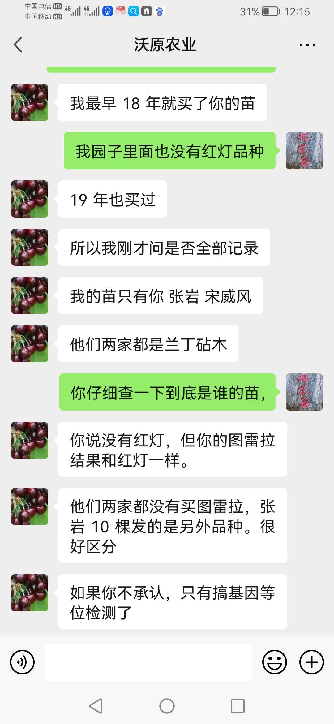 樱花谷 发表于 2023-05-10 13:11 微信跟你沟通,原来你听不懂!简直怀疑你的智商问题!首先:你无论发什么图片或者视频,都证明不了什么,因为你没有证明这树是我给你的苗!当初你一起买了三个苗商的苗,都有相同的品种,以前你说是别个苗商的出问题,现在你说是我的出问题!退一万步说,即使是我的苗出问题,你是不是应该拿出来事实证据?你提出来基因测序鉴定,我非常赞同!毕竟不是我一个人的苗,三个苗商的苗,你逮谁咬谁吗?其次:三个苗商的苗,都被你搞混淆掉,到底是什么只有你清楚,微信好好跟你沟通,你自以为是提出:基因测序鉴定!我从头到尾没有推脱过,都在跟你沟通处理,你自以为是目中无人!说话口气可以上天了!再次:你这只白眼狼,我后悔当初那么好对你,死的苗二话不说都多补给你,再给你送苗,那几年你狗屁不懂,技术上支持了你多少,你自己清楚!现在你上天了,也开始卖苗了,你能做到我一半的服务,算你了不起!你懂个球的人情世故,情商低到极点!最后,我的苗每一个品种都是从别的朋友和苗商处引进,至于说品种百分百准确,那是自欺欺人,我都不信,国内百分之九十九苗商都不敢保证!但我从没推脱过,是我的责任,我负责承担!你买了三个人的苗,随便拍两树就说是我的,能信服吗?如果只是我一个人的苗,我二话不说,马上认可!你当大家没脑子吗?回你帖子,是因为管理员联系我,我才出来回回你,否则我看不起回复你,用舆论来成就你的凌乱感吗?即使所有邦友认可你发的树结的果是某个品种,有作用吗?能证明是我的苗吗?你说是谁的苗就是谁的吗?所有情况我已经告诉管理员,聊天记录我也发给管理员!我不会再跟你这白眼狼浪费精神!