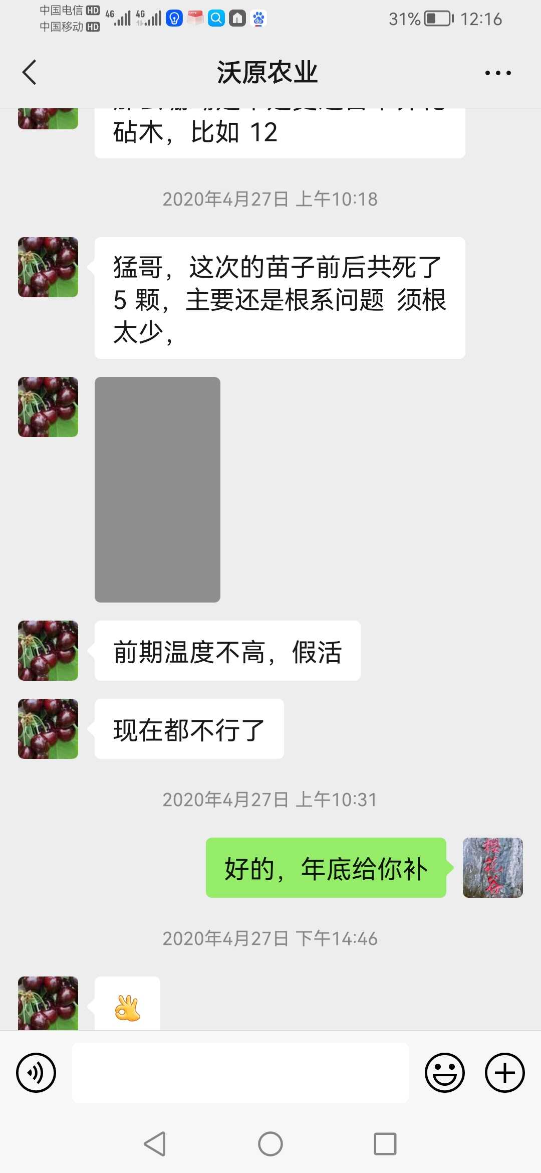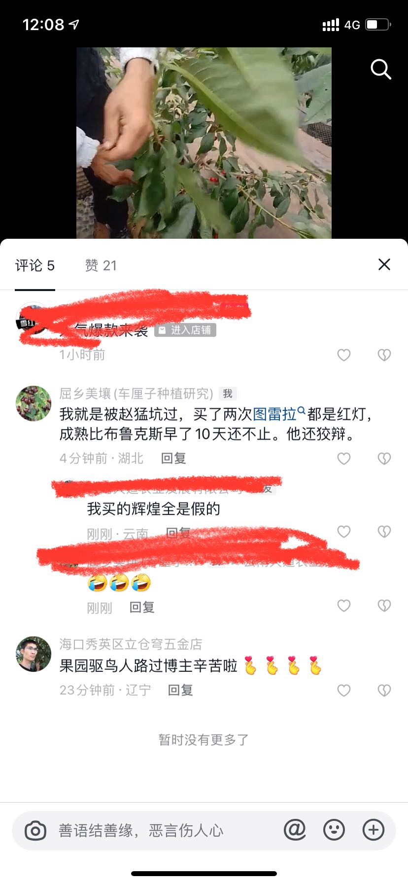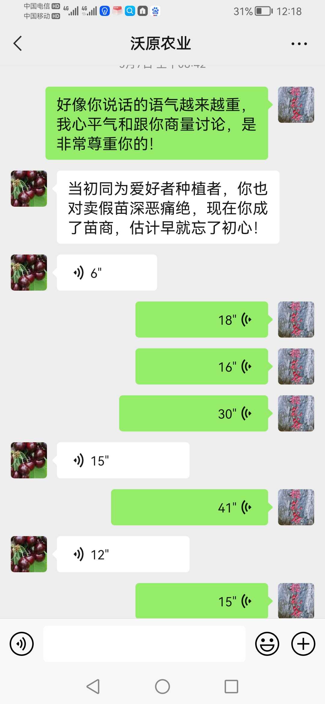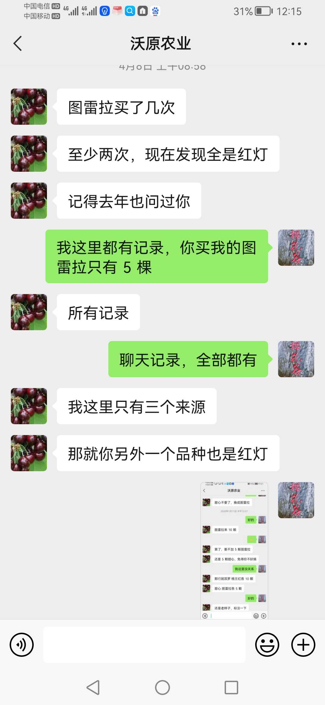 樱花谷 发表于 2023-05-10 13:11 微信跟你沟通,原来你听不懂!简直怀疑你的智商问题!首先:你无论发什么图片或者视频,都证明不了什么,因为你没有证明这树是我给你的苗!当初你一起买了三个苗商的苗,都有相同的品种,以前你说是别个苗商的出问题,现在你说是我的出问题!退一万步说,即使是我的苗出问题,你是不是应该拿出来事实证据?你提出来基因测序鉴定,我非常赞同!毕竟不是我一个人的苗,三个苗商的苗,你逮谁咬谁吗?其次:三个苗商的苗,都被你搞混淆掉,到底是什么只有你清楚,微信好好跟你沟通,你自以为是提出:基因测序鉴定!我从头到尾没有推脱过,都在跟你沟通处理,你自以为是目中无人!说话口气可以上天了!再次:你这只白眼狼,我后悔当初那么好对你,死的苗二话不说都多补给你,再给你送苗,那几年你狗屁不懂,技术上支持了你多少,你自己清楚!现在你上天了,也开始卖苗了,你能做到我一半的服务,算你了不起!你懂个球的人情世故,情商低到极点!最后,我的苗每一个品种都是从别的朋友和苗商处引进,至于说品种百分百准确,那是自欺欺人,我都不信,国内百分之九十九苗商都不敢保证!但我从没推脱过,是我的责任,我负责承担!你买了三个人的苗,随便拍两树就说是我的,能信服吗?如果只是我一个人的苗,我二话不说,马上认可!你当大家没脑子吗?回你帖子,是因为管理员联系我,我才出来回回你,否则我看不起回复你,用舆论来成就你的凌乱感吗?即使所有邦友认可你发的树结的果是某个品种,有作用吗?能证明是我的苗吗?你说是谁的苗就是谁的吗?所有情况我已经告诉管理员,聊天记录我也发给管理员!我不会再跟你这白眼狼浪费精神!