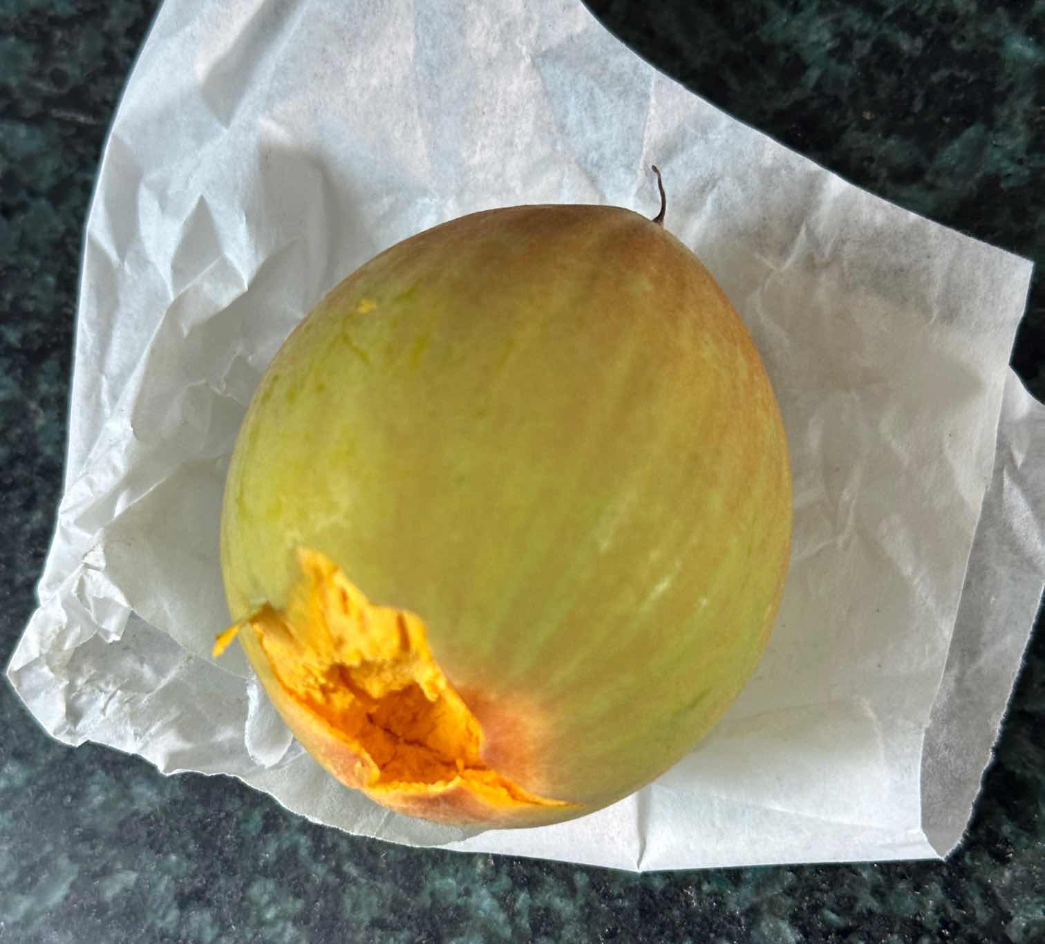 明日可待 发表于 2025-10-26 14:31 今天从树上跌落一个最小的果,这品种不能树上熟?外皮刚泛黄,捏上去还没软身,这就自己掉下来啦?!闻上去也没有榴莲香味倒是有很浓的鸡蛋果味,感觉会翻车再放上两天看看……