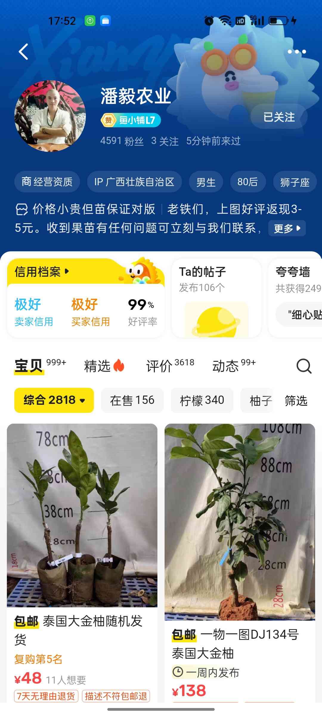 天很蓝 发表于 2025-10-07 22:32 我从广西潘毅家买了一棵大金。苗很壮很好。听好多人买过他家的,都说对版。很大的一棵,60块。