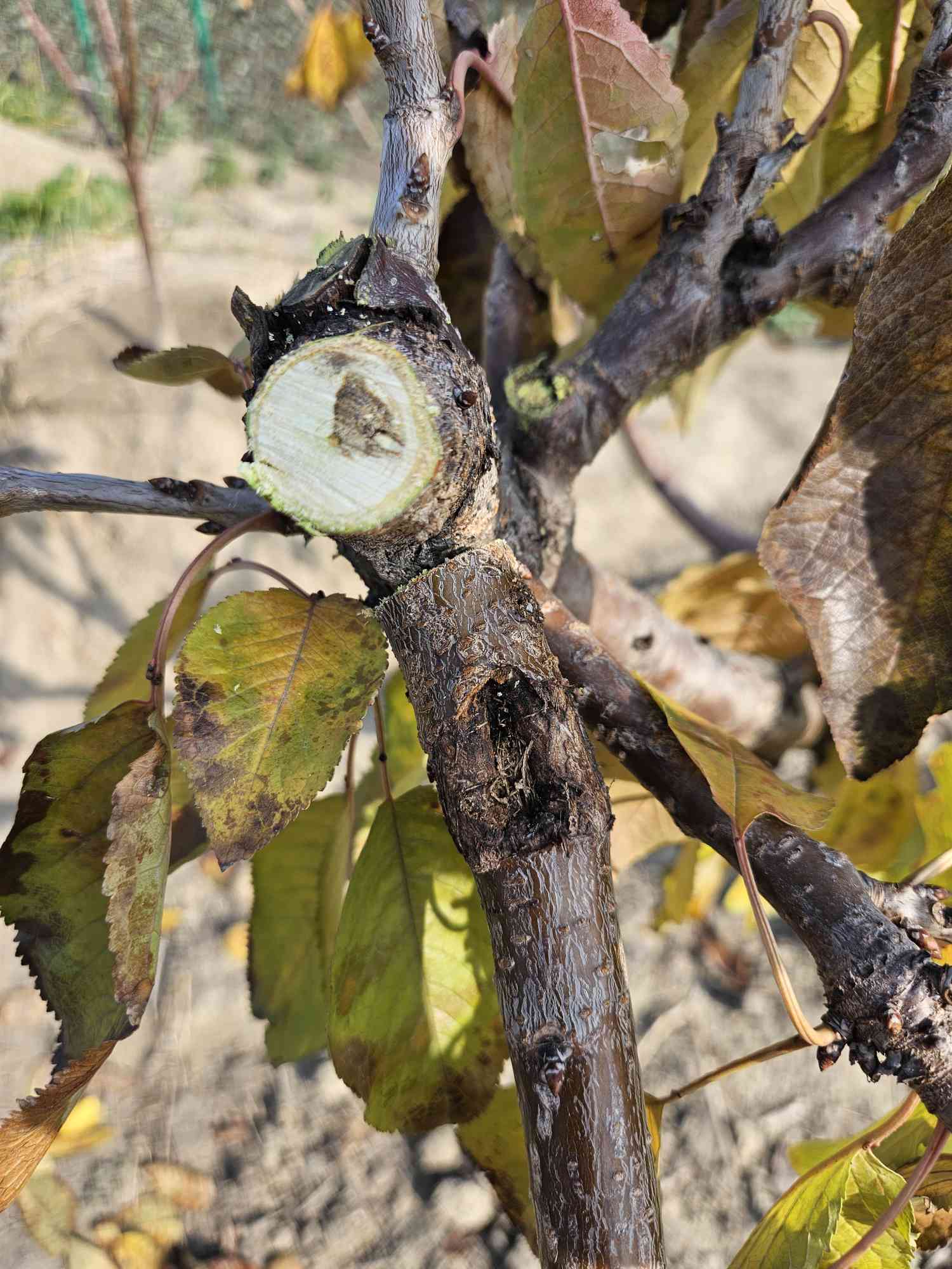 chux 发表于 2025-12-19 14:50 锯了,中间有孔,不知道有没有天牛?无木屑,直接用愈合剂涂了。 还有图2流胶枝,中心木质部是正常还是虫影响