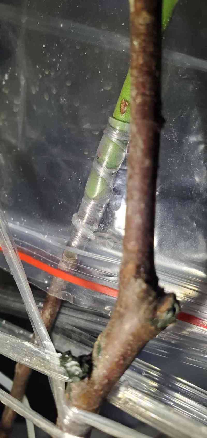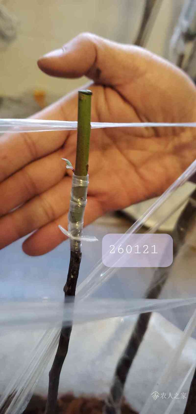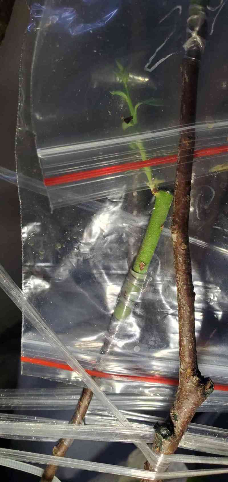 瓜牛 发表于 2026-01-23 16:11 昨天这颗枝条比较新鲜,也比较细,和接穗大小很接近,尝试用截面对接方式嫁接。