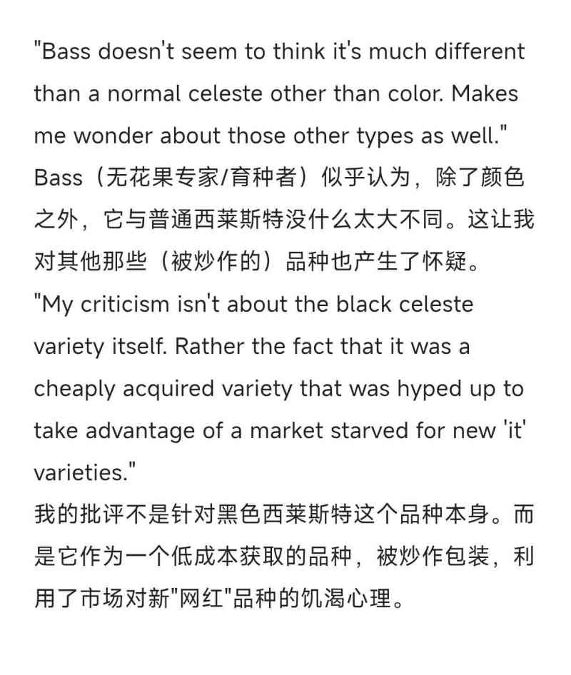 绝非偶然 发表于 2026-04-18 21:42 你种出来用事实说话!别引用!果皮剥了没多少肉的品种,哪天给你一个箩筐,你装满黑色西莱再说!我是看到外网有评论说是炒作,在美国,它就是非主流品种,最多做果干,而且果干还品质还不如黑色使命,果干价格也不高