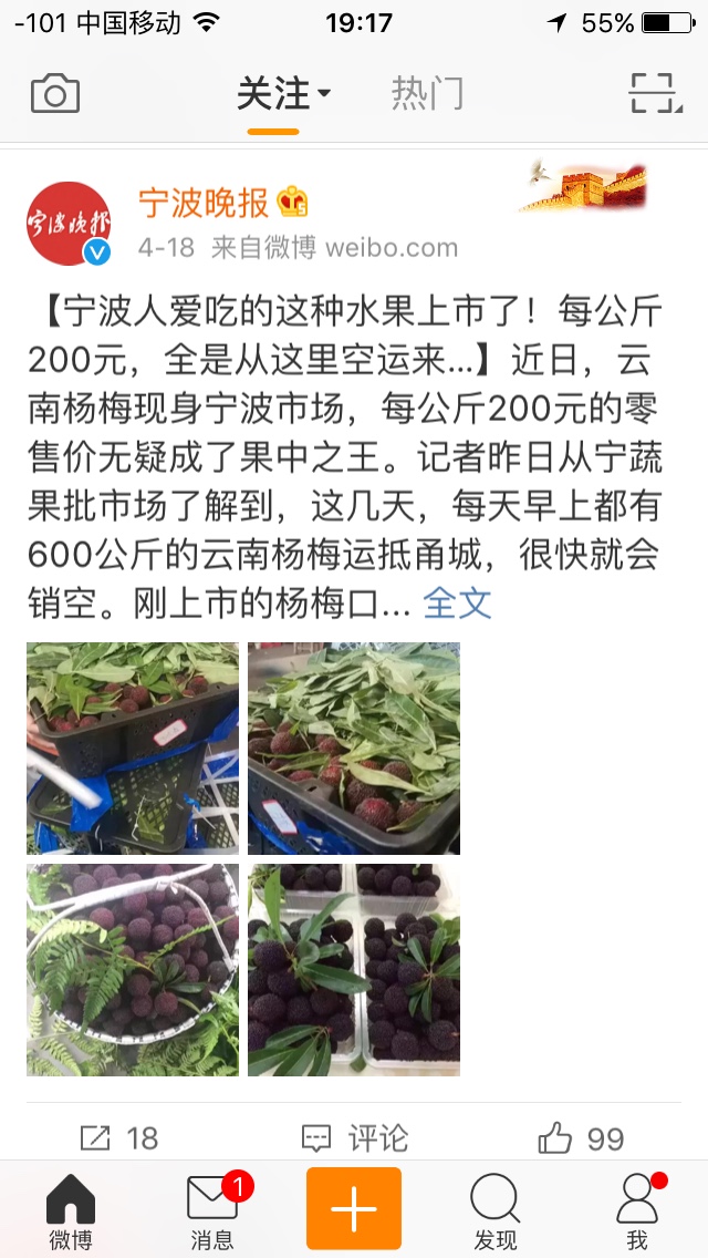 风子语 发表于 2018-04-21 15:44 现在云南昆明杨梅已经在卖了,我们这边100多一斤