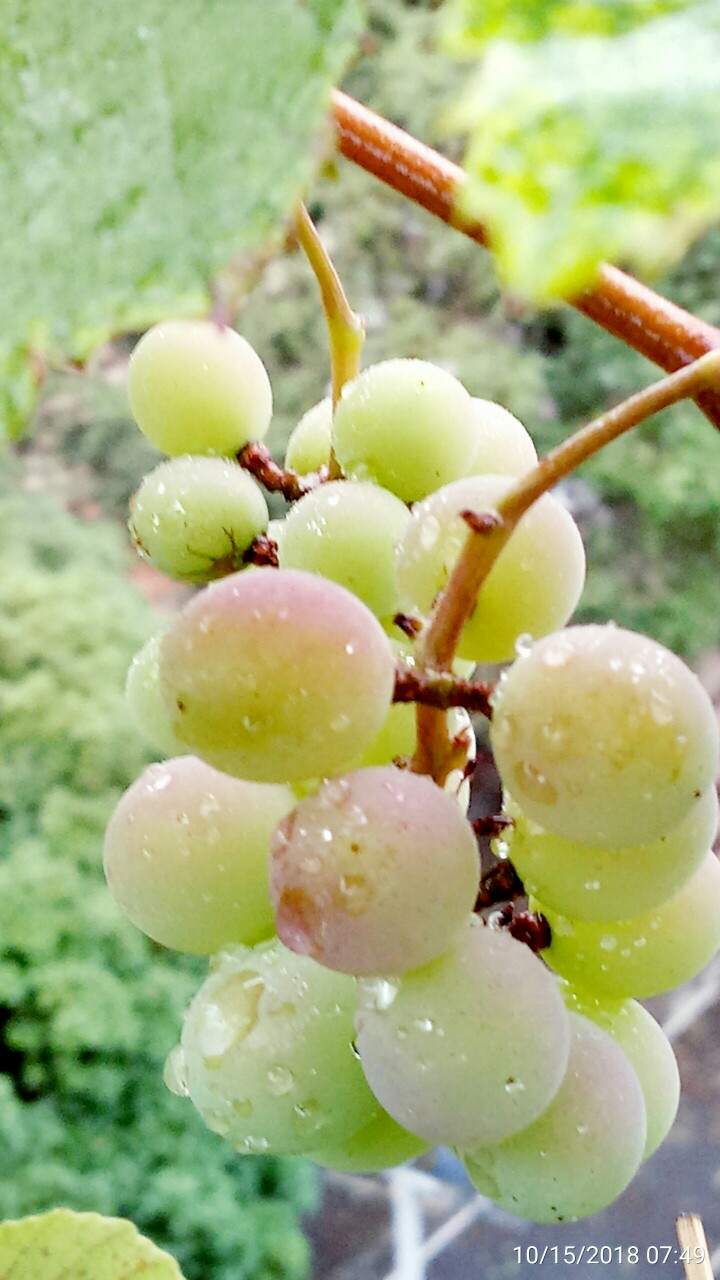 春雨春烟 发表于 2018-10-26 11:04 本帖最后由 春雨春烟 于 2018-10-26 11:08 编辑 深秋的南方,蒙蒙细雨里的假一号二次果,同一结果枝上的两串葡萄,黑色的一串果实已软化成熟了,看来假一号能串摘,哪串熟了剪哪串,隔三差五的去收一批果实就可以了,我的先让它继续挂着,挂到十二月落叶了再说。